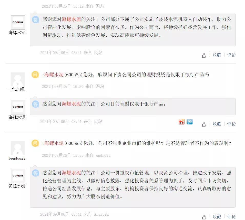 海螺水泥股價持續下跌,引起了股民不滿。有股民公開向海螺水泥提問,“請董秘出來說下,現在經營情況,股價下跌問題,給股民一個交代”。