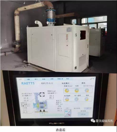 達成合作后,雷茨智能技術人員第一時間上門對該水泥廠進行現場勘察,經過多次的實時測試和技術討論,最終決定在滿足其生產工藝的情況下,用一臺電機功率75KW的離心式雷茨空氣懸浮離心風機替代該水泥廠原有的電機功率110KW的容積式羅茨風機。