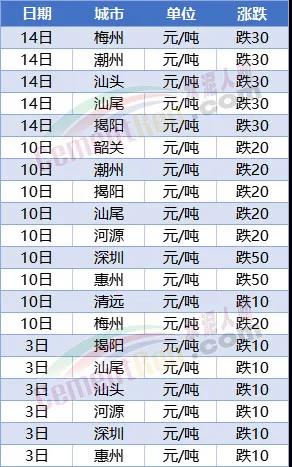 本月廣東省內(nèi)多區(qū)域分別于3日、10日、14日前后三次下調(diào)水泥價(jià)格。其中揭陽(yáng)、汕尾區(qū)域三次累計(jì)下跌60元/噸,深圳、惠州于1日、10日兩次下跌累計(jì)60元/噸,梅州、潮州、汕頭兩次累計(jì)下跌50元/噸。