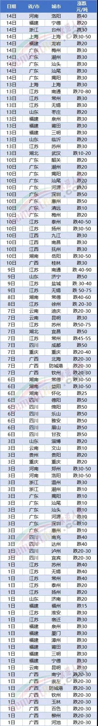 同期周邊江蘇、浙江區(qū)域同步下調(diào)水泥價(jià)格。其中江蘇蘇州本月內(nèi)已累計(jì)三次下調(diào),分別于1日下調(diào)30元/噸,7日下調(diào)50-75元/噸,13日再次下調(diào)30元/噸;11月分別于23日下跌20元/噸,11日下跌30元/噸,累計(jì)下跌近200元/噸。