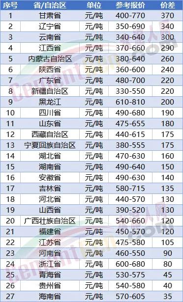 水泥人網(wǎng)信息中心監(jiān)控?cái)?shù)據(jù)顯示:甘肅省內(nèi)各企業(yè)P.O42.5散裝水泥報(bào)價(jià)在400-770元/噸之間,高低價(jià)之間相差達(dá)370元/噸。遼寧省參考報(bào)價(jià)在350-690元/噸之間,高低價(jià)之間相差340元/噸。云南省參考報(bào)價(jià)在340-640元/噸之間,高低價(jià)之間相差300元/噸。