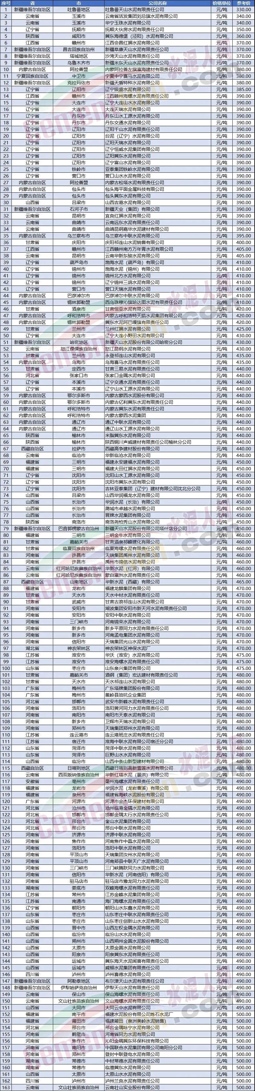 部分區(qū)域P.O42.5散裝水泥參考報(bào)價(jià)及區(qū)域各品牌價(jià)差一覽: