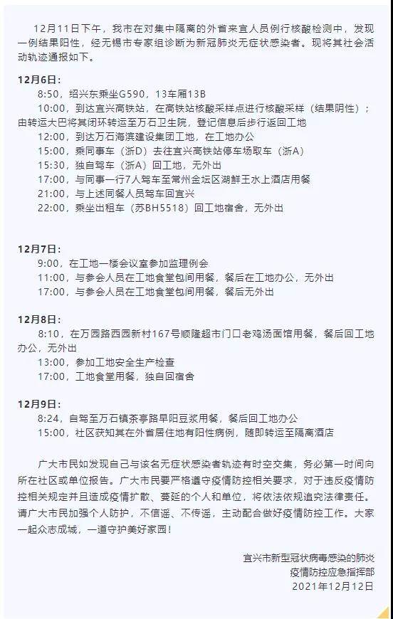 日前 ,江蘇宜興市通報發現一例新冠肺炎無癥狀感染者。通報顯示,該感染者6日從浙江紹興到宜興,期間在萬石海濱建設集團工地等區域活動,從其活動軌跡可見,該感染者曾參加監理例會和工地安全生產檢查。經排查,密切接觸者共63人,次密切接觸者共560人。全部集中隔離并規范開展核酸檢測,已出結果均為陰性。