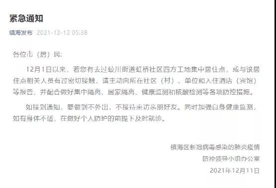 繼江蘇宜興之后,浙江寧波同一工地13人確診。浙江寧波鎮海區發布緊急通知,要求自12月1日以來,有去過蛟川街道虹橋社區四方工地集中居住點,或與該居住點相關人員有過密切接角的人員主動向所在社區(村)、單位和入住酒店(賓館)等報告 。
