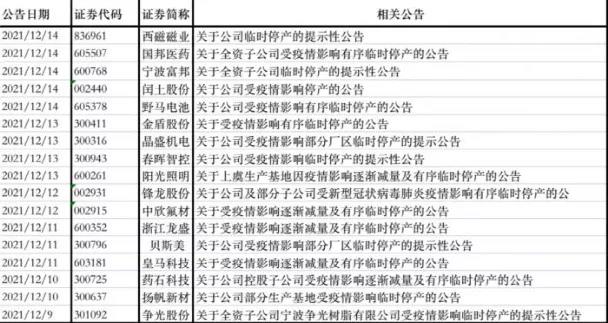 12月13日0-24時,新增確診病例45例,其中杭州市2例、寧波市4例、紹興市38例、境外輸入1例(剛果金輸入),已排查密切接觸者均已實施集中隔離。浙江全省已累計納入隔離管控540430人,其中集中隔離52824人,居家健康觀察21835人,日常健康監測465771人。近20家A股上市企業發布停產公告,且未明確復產時間。