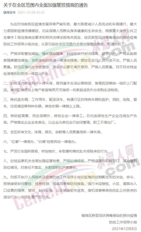 目前,寧波市繼續維持全市I級響應不變,繼續維持鎮海區臨時封閉管理措施不變,浙江省嚴控跨省出行不變。