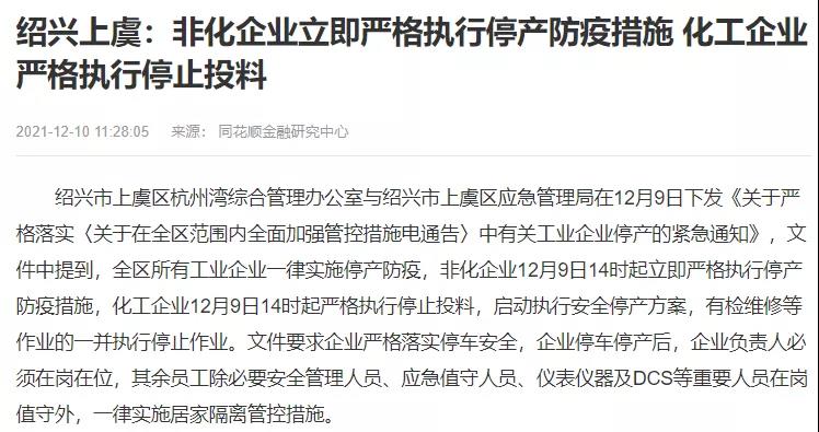 全區所有工業企業一律實施停產防疫,非化企業12月9日14時起立即嚴格執行停產防疫措施,化工企業12月9日14時起嚴格執行停止投料,啟動執行安全停產方案,有檢維修等作業的一并執行停止作業。