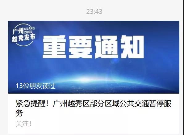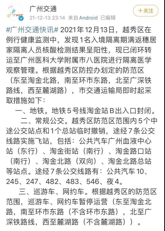廣州越秀區部分區域公共交通暫停服務。根據越秀區防控辦劃定的防范區(東至淘金北路,南至環市東路,北至廣深鐵路線,西至麓湖路),廣州市交通運輸局即時起采取措施如下: