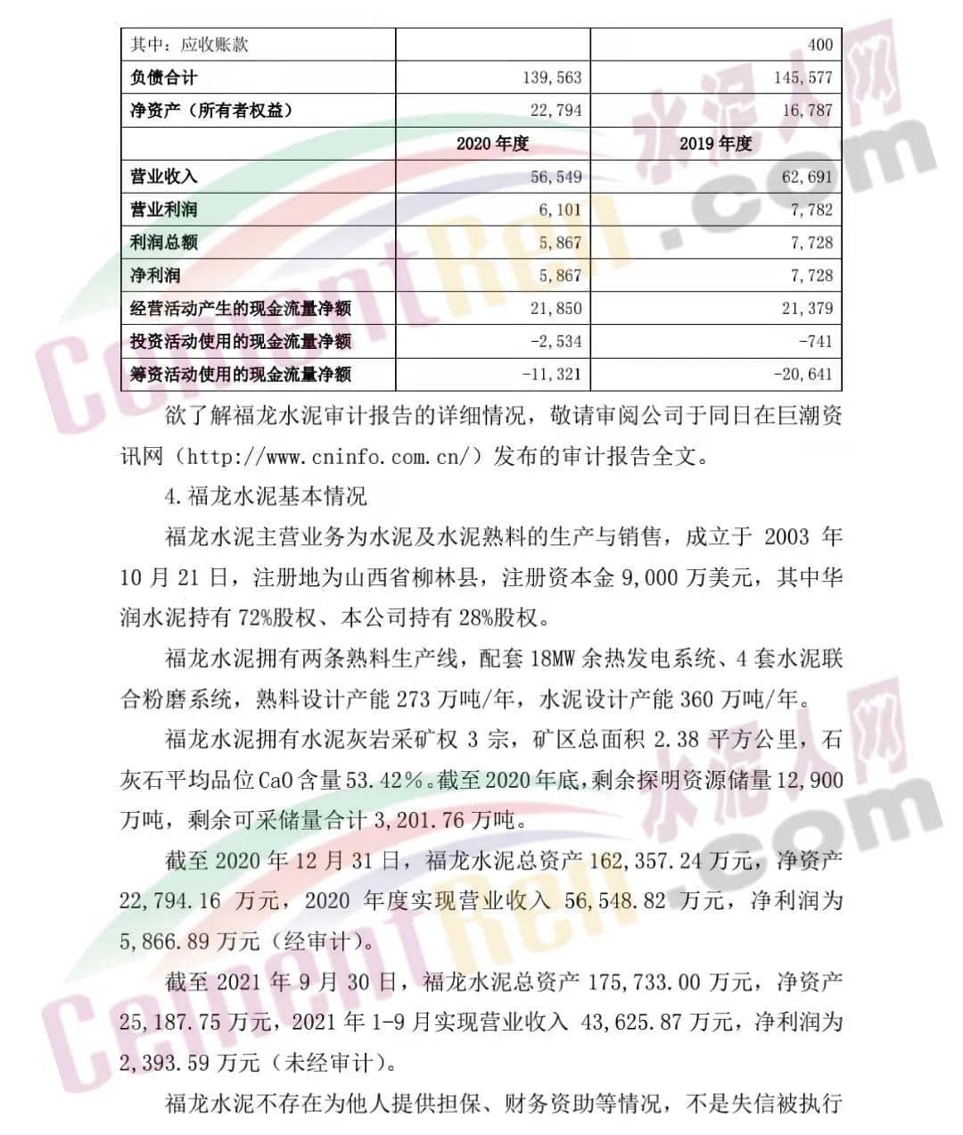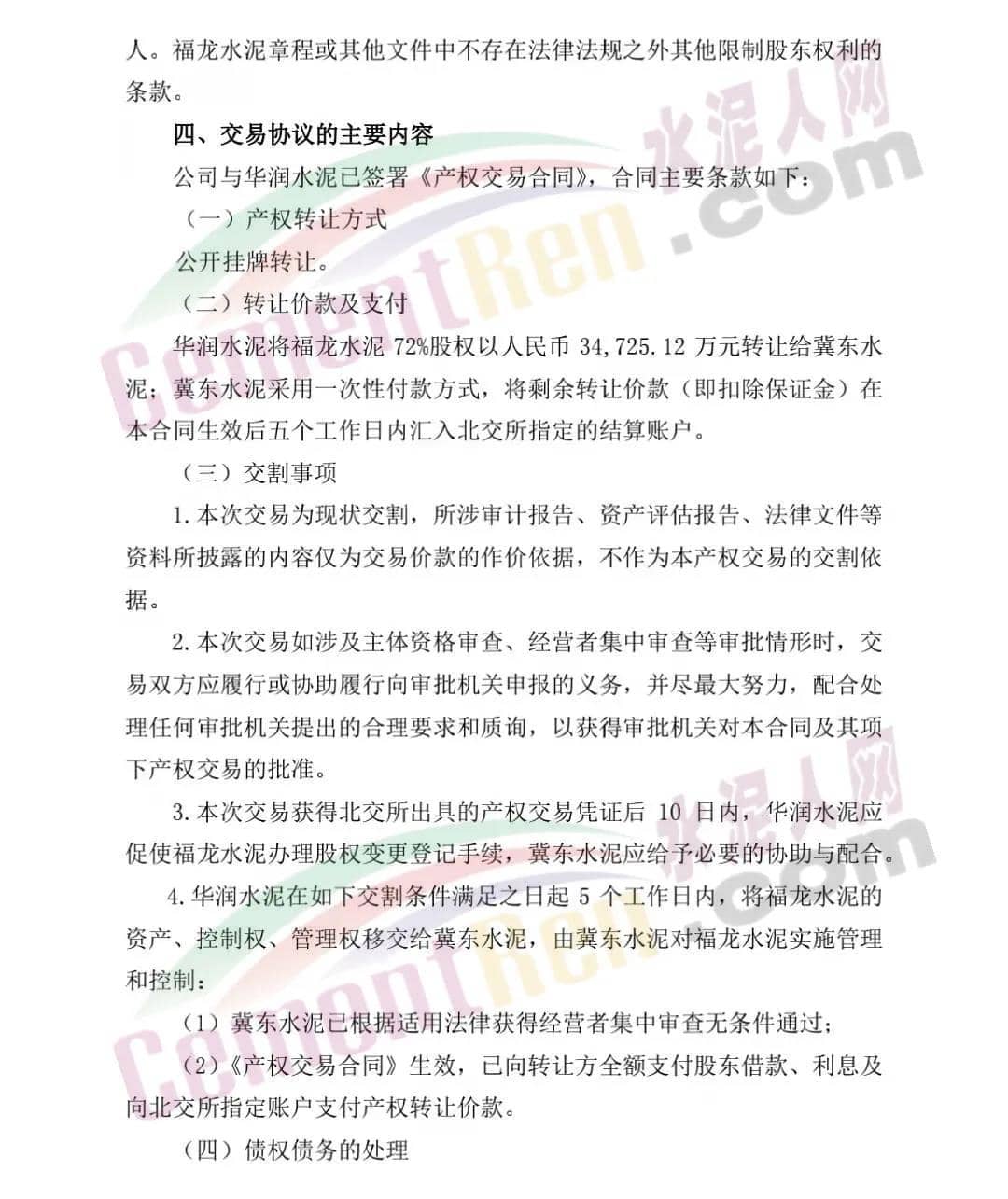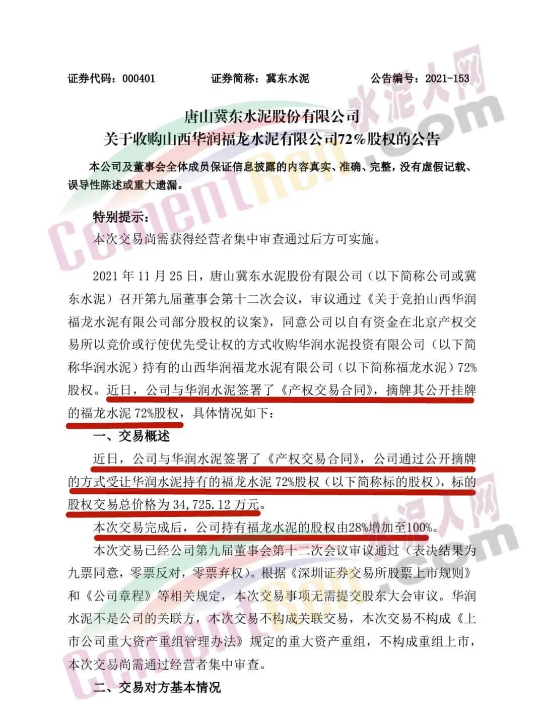 12月15日晚間,冀東水泥發(fā)布公告稱(chēng),近日,公司通過(guò)公開(kāi)摘牌的方式受讓華潤(rùn)水泥持有的福龍水泥72%股權(quán),標(biāo)的股權(quán)交易總價(jià)格為3.47億元。此次交易完成后,公司持有福龍水泥的股權(quán)由28%增加至100%。福龍水泥擁有完整的水泥熟料生產(chǎn)線,裝備和工藝水平比較先進(jìn),擁有資源品位較好的石灰石礦山,周邊輔材豐富,生產(chǎn)成本在區(qū)域處于領(lǐng)先水平。此次交易有利于公司優(yōu)化山西區(qū)域的產(chǎn)能結(jié)構(gòu)。