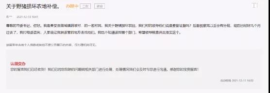 秦安縣隴城鎮陰坡村的一名村民留言稱,野豬損壞農田后村的領導說要留證據,視察完以后會有補貼,現在已經好幾個月過去了,讓到該管的地方去找他們。村民也不知道該找哪個部門,希望領導核查并且落實這個。