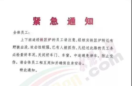 在內蒙古草原地區,一家水泥企業曾發緊急通知提示上下班途經有狼出沒路段的的員工需注意躲避野狼,務必檢查好車況,關閉好車門、車窗,中途避免停車,防止受傷。