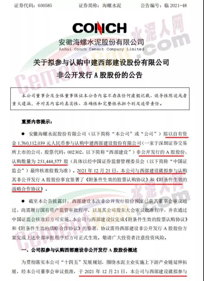 海螺水泥公告稱,為貫徹落實本公司“十四五”發展規劃,圍繞水泥主業實施上下游產業鏈延伸拓展,經本公司董事會審議批準,于2021年12月21日,本公司與西部建設就擬參與認購其非公開發行股份事宜簽署了《附條件生效的股票認購協議》和《附條件生效的戰略合作協議》。西部建設是國內領先的建材產業綜合服務商,也是國內商品混凝土行業的領軍企業,本公司擬通過認購其非公開發行A股股份的方式,進一步加強雙方在原材料供銷、混凝土業務、砂石骨料業務、物流運輸、產業互聯網等方面的戰略合作。