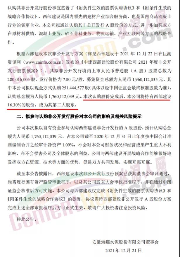 海螺水泥12月21日晚間公告,擬以自有資金約17.6億元人民幣參與認購西部建設非公開發行的A股股份,認購數量為2.51億股。本次認購股份完成后,本公司將持有西部建設16.3%的股份,成為其第二大股東。