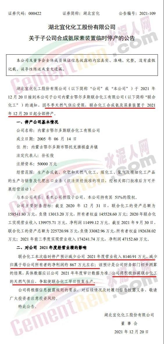 近日,國內化肥巨頭湖北宜化集團發布公告稱,于2021年12月20日接到其子公司內蒙古鄂爾多斯聯合化工有限公司的通知,因冬季天然氣供應受限,聯合化工合成氨及尿素裝置于2021年12月20日起全部停產。