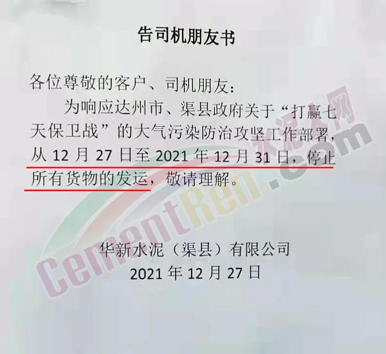 水泥人網通訊員消息:華新水泥渠縣公司發布通知稱,為響應達州市、渠縣政府關于“打贏七天保衛戰的大氣污染防治攻堅工作部署”從12月27日至12月31日停止所有貨物的發運。
