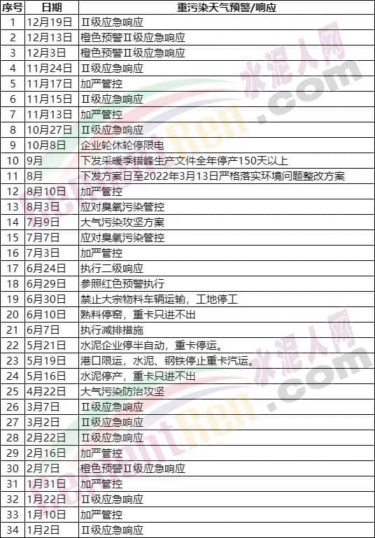 從上述管控措施來看,無論是加嚴管控還是直接發布橙色預警Ⅱ級應急響應,其管控要求均有關于水泥熟料、粉磨、商砼企業停限產,重卡物流限運或只進不出,下游工地停工等。