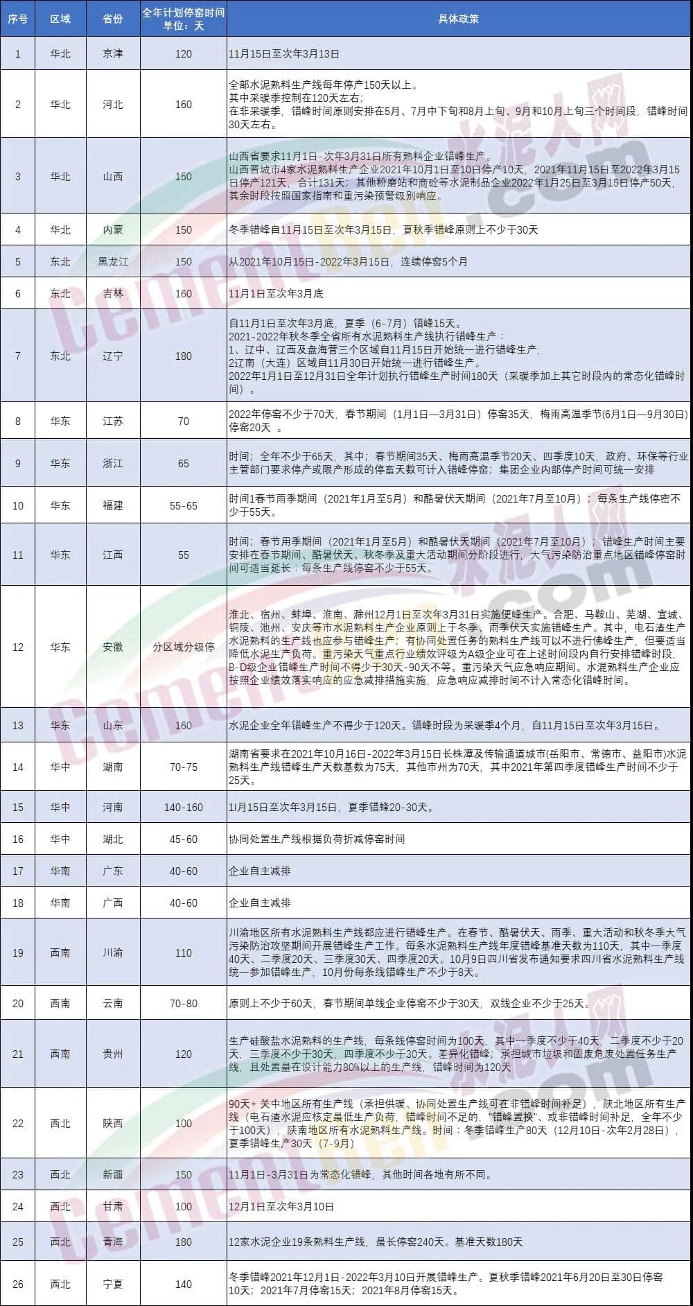 另據水泥人網近期消息,各區域水泥行業2022年錯峰生產計劃出臺,2022年最長停產區域達180天。河北金隅鼎鑫水泥有限公司2000t/d生產線2022年非采暖季錯峰30天,采暖季錯峰260天,合計停產天數達290天。