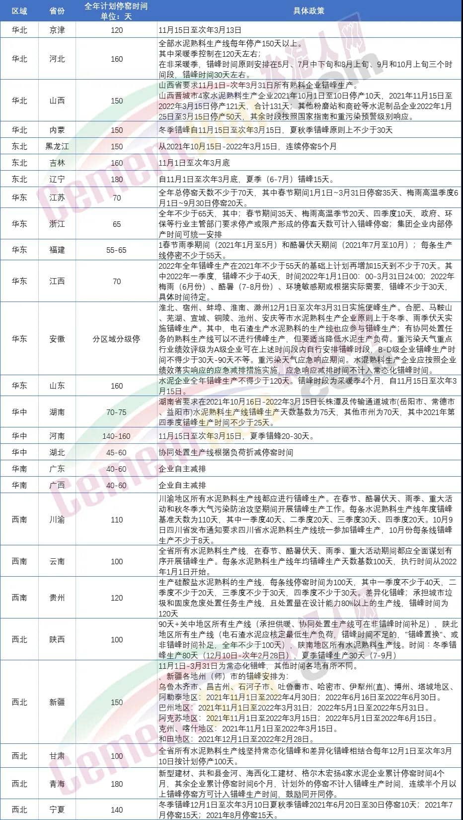 應(yīng)工信部、生態(tài)環(huán)境部?jī)刹课P(guān)于進(jìn)一步做好水泥常態(tài)化錯(cuò)峰生產(chǎn)的通知要求,絕大部分省份都提前發(fā)布了2022年全年錯(cuò)峰生產(chǎn)計(jì)劃,全年停產(chǎn)基準(zhǔn)天數(shù)最長(zhǎng)達(dá)到180天。