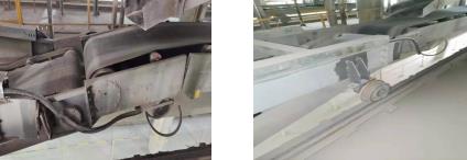 4.1對皮帶輸送機架進行了改善:原來進料平皮帶與出料斜皮帶兩行走輪間距過大,斜皮帶機頭部又安裝了懸掛式袋裝移動小車升降機構(gòu),在裝車過程中出現(xiàn)平、斜皮帶機滾筒聯(lián)接處斷裂故障三次。通過現(xiàn)場裝車時觀察及與智能公司的溝通,在兩皮帶聯(lián)接處增設(shè)一組行走平輪(見圖4),增加平、斜皮帶間的支撐力,避免機架聯(lián)接處開裂,造成停機故障。