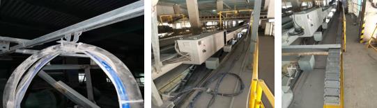 4.2對裝車機移動電源線進行了改善:由于原來設(shè)計失誤,電源線采用吊掛移動式,在小車頻繁的移動過程中,發(fā)生掛鉤脫落故障,由于崗位人員沒有及時發(fā)現(xiàn),造成小車移動時對電源線,氣管、信號線壓斷,造成停機故障。采用托鏈式替代吊掛式移動小車主電源(見圖5)。