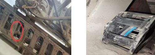 4.5 2#智能裝車機運行到6個月后,出現(xiàn)機頭內(nèi)小車放料翻板運行過程中不放料,安排維護人員進行了排查,是電磁閥的電源線纜不通造成,更換了損壞的電源線纜,恢復正常生產(chǎn)。在隨后頻繁出現(xiàn)類似故障,更換在線線纜后恢復正常,一周后又出現(xiàn)翻板打不開故障。通過對故障的分析,在線電纜不適合頻繁移動,造成故障停機,將原RVV型號的信號線纜更換為TRVV信號線纜,徹底解決了這一故障(見圖8)。