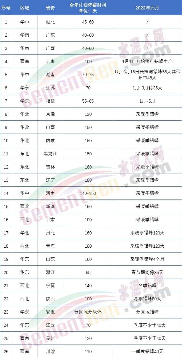 據水泥人網不完全統計,目前已經有26個地區發布了2022年錯峰生產計劃,除華中南湖北、廣東、廣西外,其他23個區域本月內均有企業處于錯峰停產中。