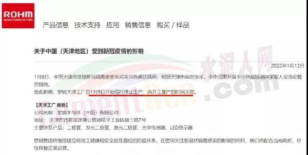 1月12日,日本羅姆半導體 (Rohm Semiconductor)通過官網對外宣布,由于中國天津市發現新冠病毒奧密克戎變異株確診病例,根據天津市政府指示,全市范圍開展全員核酸檢測并采取人員流動管控措施。受此影響,羅姆天津工廠自1月9日開始臨時停止生產,再度復工時間未定。