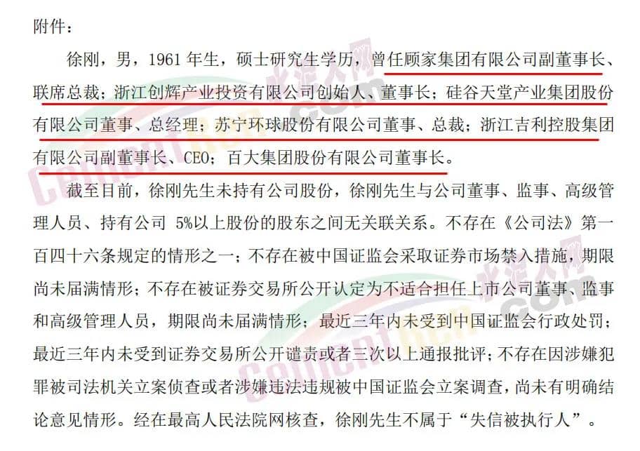 新任董事長徐剛簡歷顯示,其曾任顧家集團(tuán)有限公司副董事長、聯(lián)席總裁;浙江創(chuàng)輝產(chǎn)業(yè)投資有限公司創(chuàng)始人、董事長;硅谷天堂產(chǎn)業(yè)集團(tuán)股份有限公司董事、總經(jīng)理;蘇寧環(huán)球股份有限公司董事、總裁;浙江吉利控股集團(tuán)有限公司副董事長、CEO;百大集團(tuán)股份有限公司董事長。