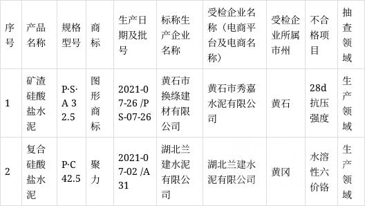 近日,湖北省市場監管局通報134種工業產品質量監督抽查結果。其中,抽查了63家企業生產的120批次水泥,檢測發現不合格產品2批次,不合格項目為28d抗壓強度、水溶性六價鉻。