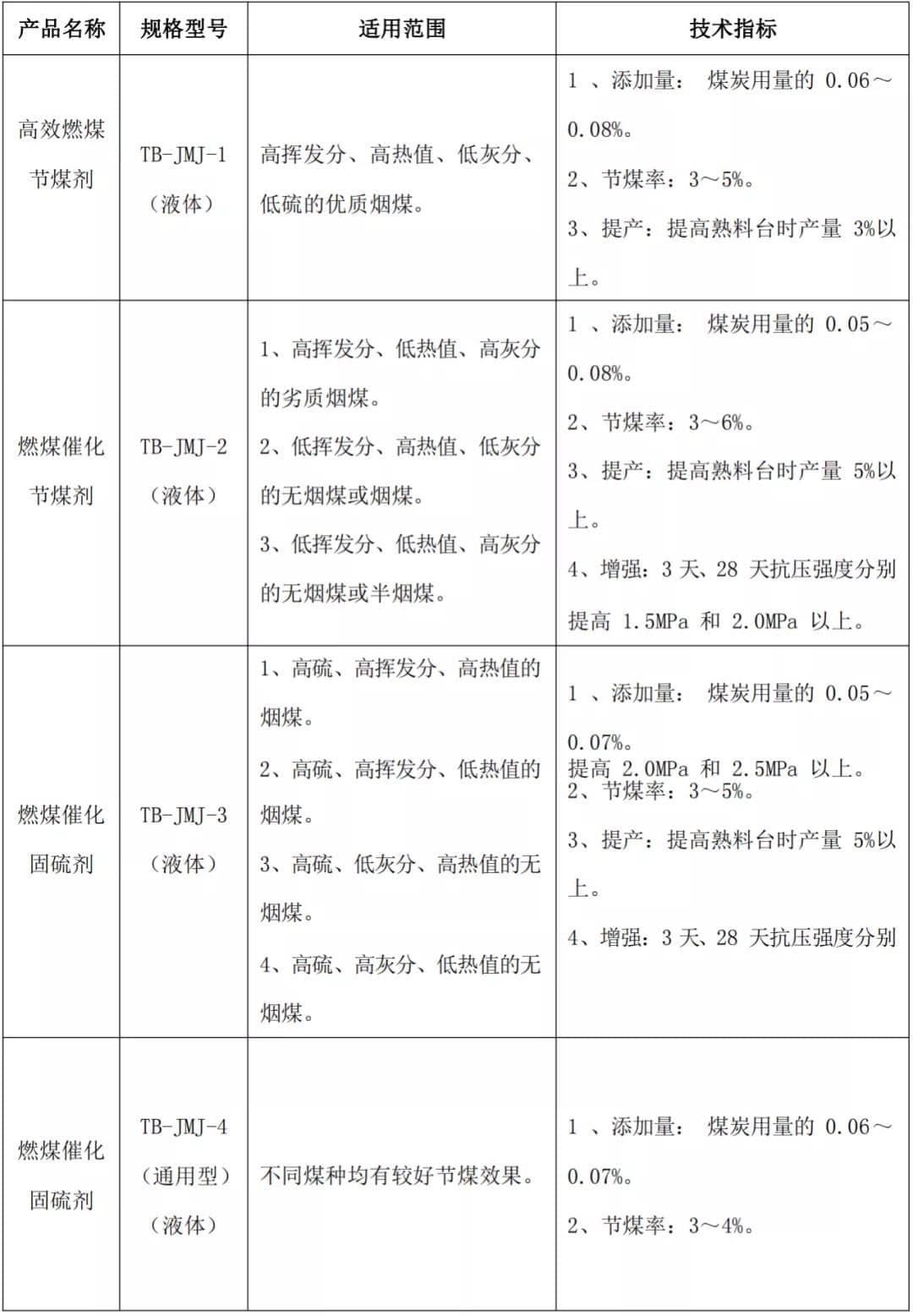 燃煤助燃固硫劑為遼寧天寶的專利產(chǎn)品,據(jù)了解,用戶使用 TB-JMJ 燃煤助燃固硫劑系列產(chǎn)品可使噸熟料實物煤耗(或標(biāo)準(zhǔn)煤耗)降低 2~5%。