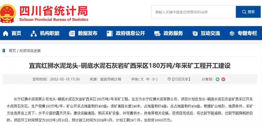 四川省統(tǒng)計(jì)局消息,長寧紅獅水泥有限公司龍頭-硐底水泥石灰?guī)r礦西采區(qū)180萬噸/年采礦工程,業(yè)主為長寧紅獅水泥有限公司,項(xiàng)目計(jì)劃在龍頭-硐底水泥石灰?guī)r礦西采區(qū)開采水泥用石灰石,生產(chǎn)規(guī)模180萬噸/年。