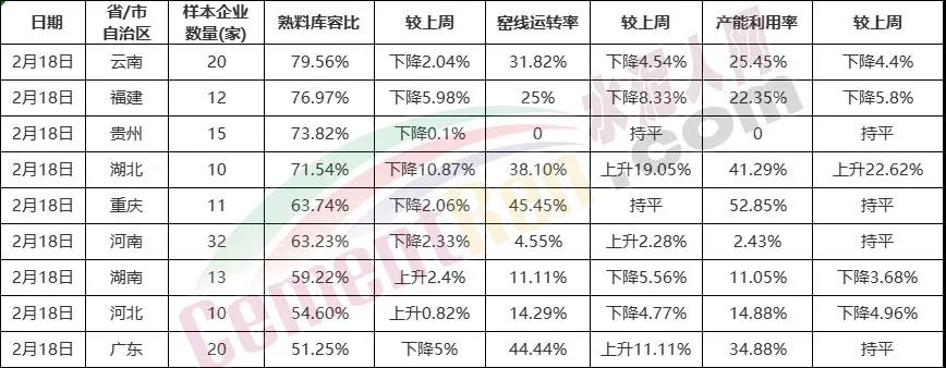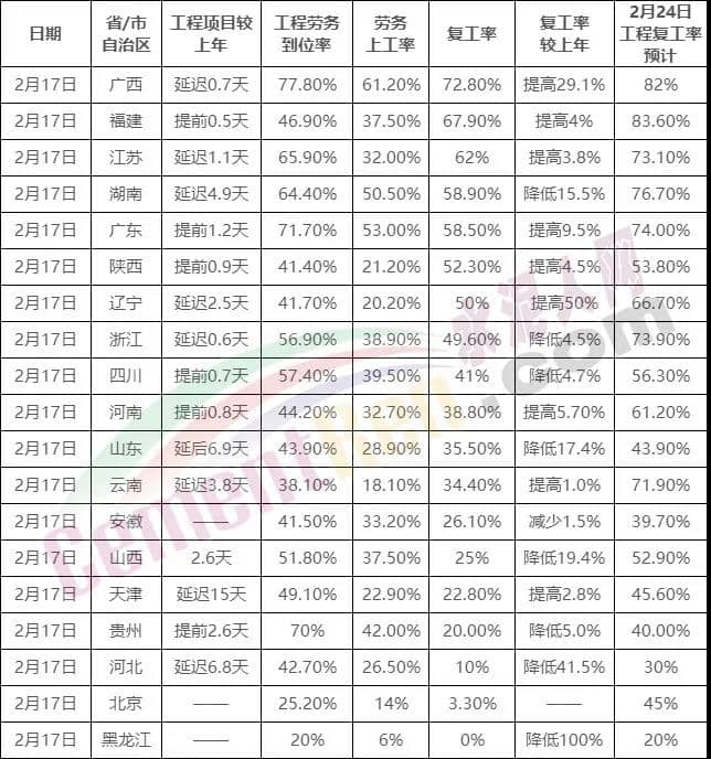 工程方面,以上19個省市自治區(qū)中福建、廣東、陜西 、四川、河南、貴州等6個省較上年同期有所提前,其中貴州省提前了2.6天。黑龍江、河北、貴州、山東、山西、四川、浙江、湖南等省復(fù)工率較上年均有降低,黑龍江工程復(fù)工率為0,工程勞動到位率僅為20%。預(yù)計本月24日前后,上述19個省市自治工程復(fù)工率最高可達(dá)80%。