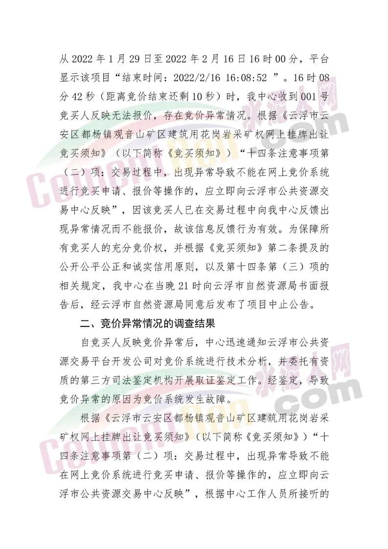 云浮市公共資源交易中心《關(guān)于恢復(fù)云自然資礦交出告字(2021〕1號采礦權(quán)出讓項目競價程序的公告》稱,經(jīng)查明001號競買人在競價過程中出現(xiàn)不能正常報價的原因是競價系統(tǒng)出現(xiàn)故障。2022年2月16日當(dāng)天競價系統(tǒng)自動生成的競價結(jié)果無效。
