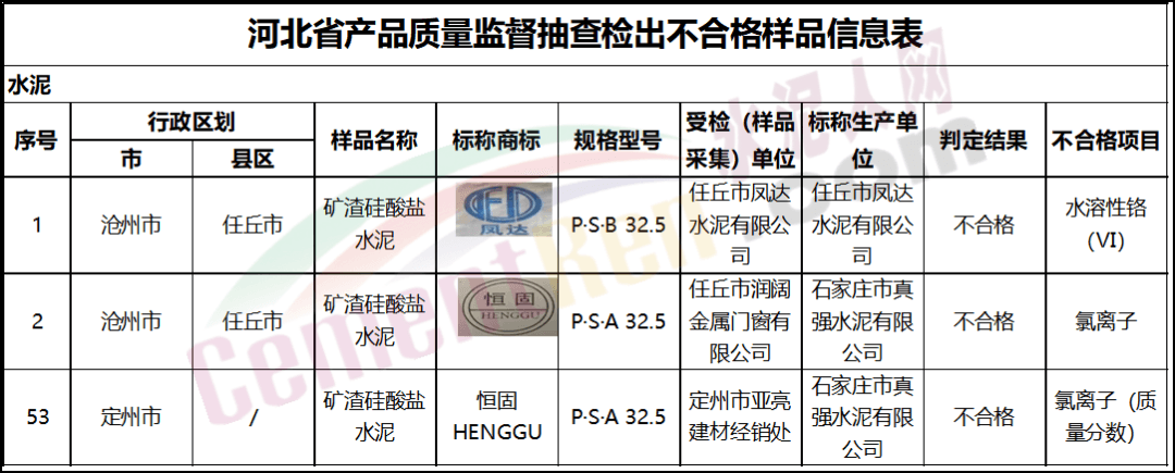 受檢樣品標(biāo)稱生產(chǎn)單位分別為任丘市鳳達(dá)水泥有限公司、石家莊市真強(qiáng)水泥有限公司兩家企業(yè),不合格樣品分別為礦渣硅酸鹽水泥P.S.B32.5和P.S.A32.5水泥。