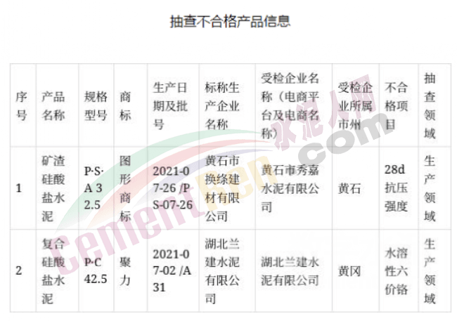 湖北省市場(chǎng)監(jiān)管局通報(bào)兩個(gè)批次水泥產(chǎn)品不合格,不合格項(xiàng)目為28天抗壓強(qiáng)度、水溶性六價(jià)鉻。