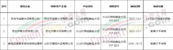 山東省棗莊市市場(chǎng)監(jiān)督管理局公布水泥質(zhì)量抽查結(jié)果顯示3批次出現(xiàn)不合格。不合格項(xiàng)目為28天抗壓強(qiáng)度和氯離子,不合格品標(biāo)稱企業(yè)為棗莊市誠(chéng)意水泥有限公司、棗莊廬泰水泥有限公司、山東石榴園水泥有限公司。