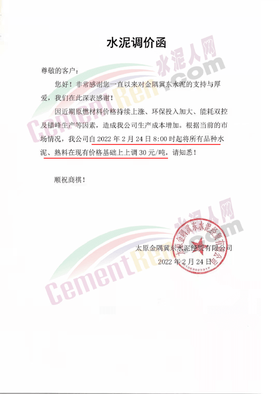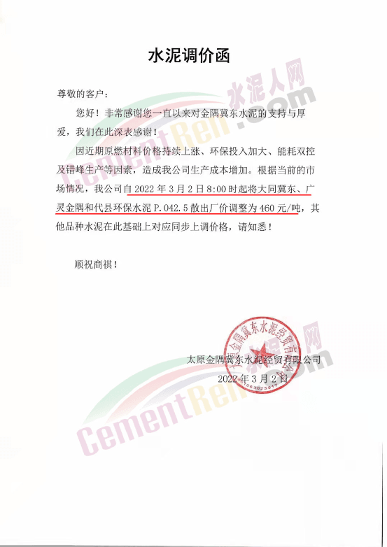 水泥人網通訊員消息:日前,太原金隅冀東水泥經貿有限公司通知,因近期原燃材料價格持續上漲、環保投入加大、能耗雙控及錯峰生產等因素,造成公司生產成本增加。根據當前的市場情況,公司自2022年3月2日8時起將大同冀東、廣靈金隅和代縣環保水泥P.O42.5散出廠價調整為460元/噸,其他品種水泥在此基礎上對應同步上調價格。