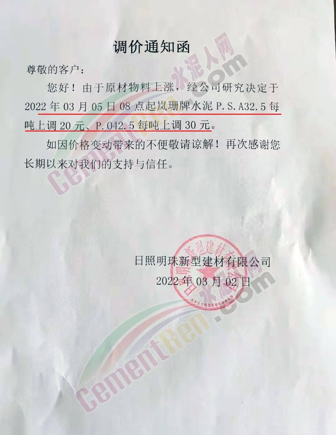 同日,山東日照明珠新型建材有限公司通知,由于原材物料上漲,經公司研究決定于2022年3月5日8時起嵐珊牌水泥P.S.A32.5每噸上調20元、P.O42.5每噸上調30元。