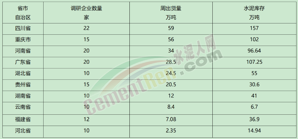 部分省市自治區水泥出貨量及庫存量一覽