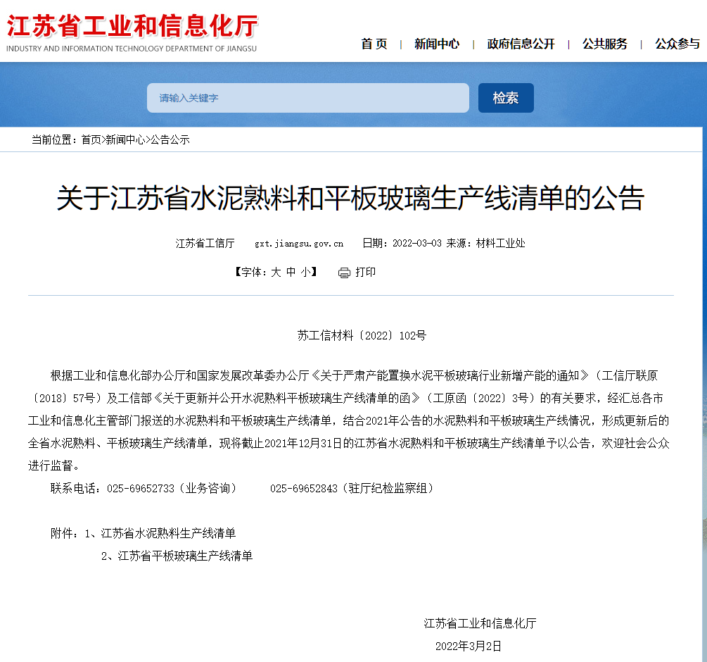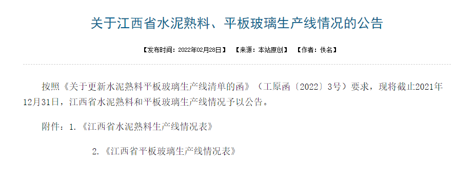 日前,江西省工業和信息化廳發布了江西省水泥熟料、平板玻璃生產線情況的公告。