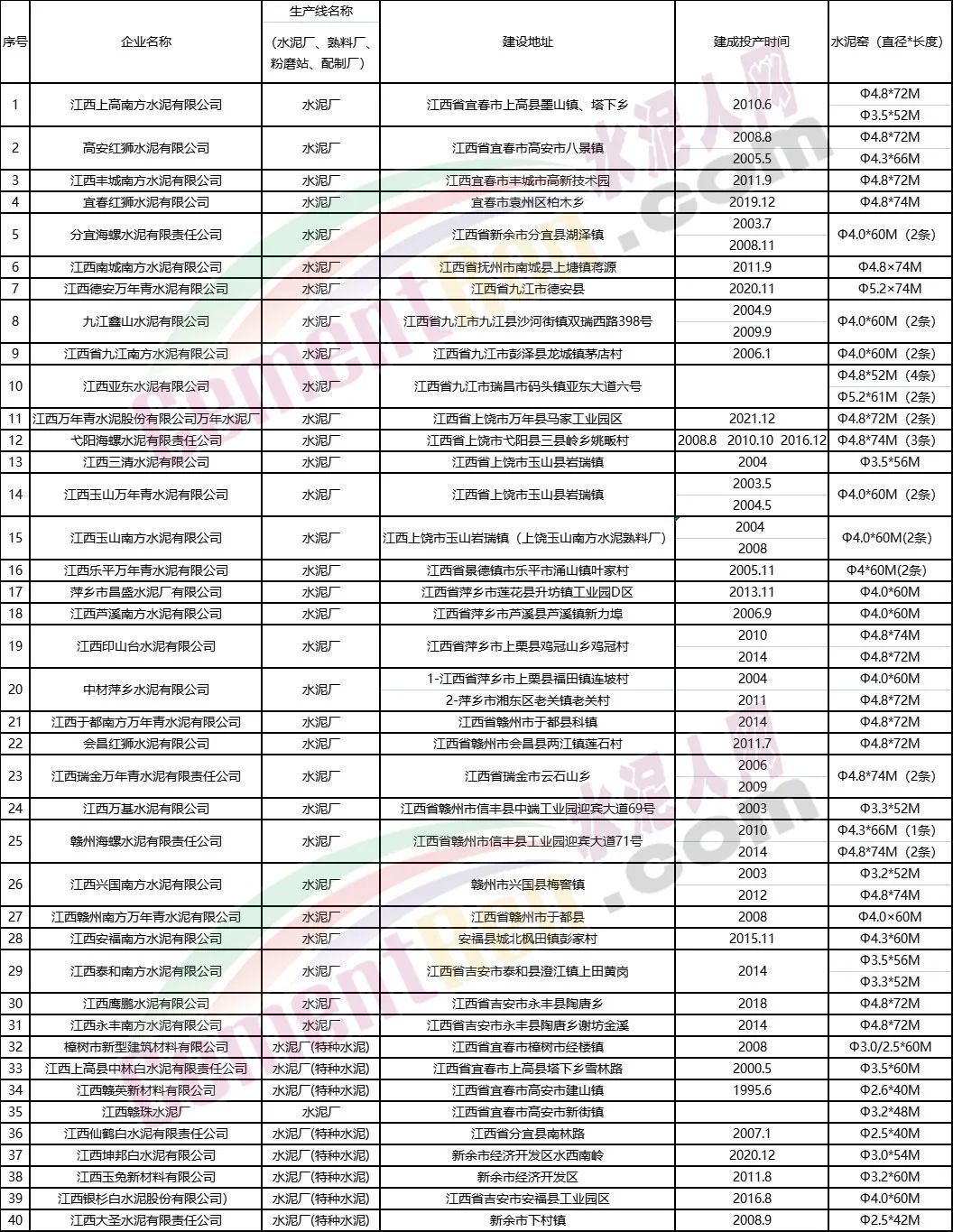 截止到2021年12月31日止,江西省共有包括8條特種水泥熟料生產線在內的水泥熟料生產線共63條,其中包括于2021年12月建成投產的江西萬年青水泥股份有限公司萬年水泥廠兩條5000t/d熟料生產線及2020年建成投產的江西德安萬年青水泥有限公司一條6000t/d水泥熟料生產線和江西坤邦白水泥有限公司800t/d特種水泥熟料生產線。?