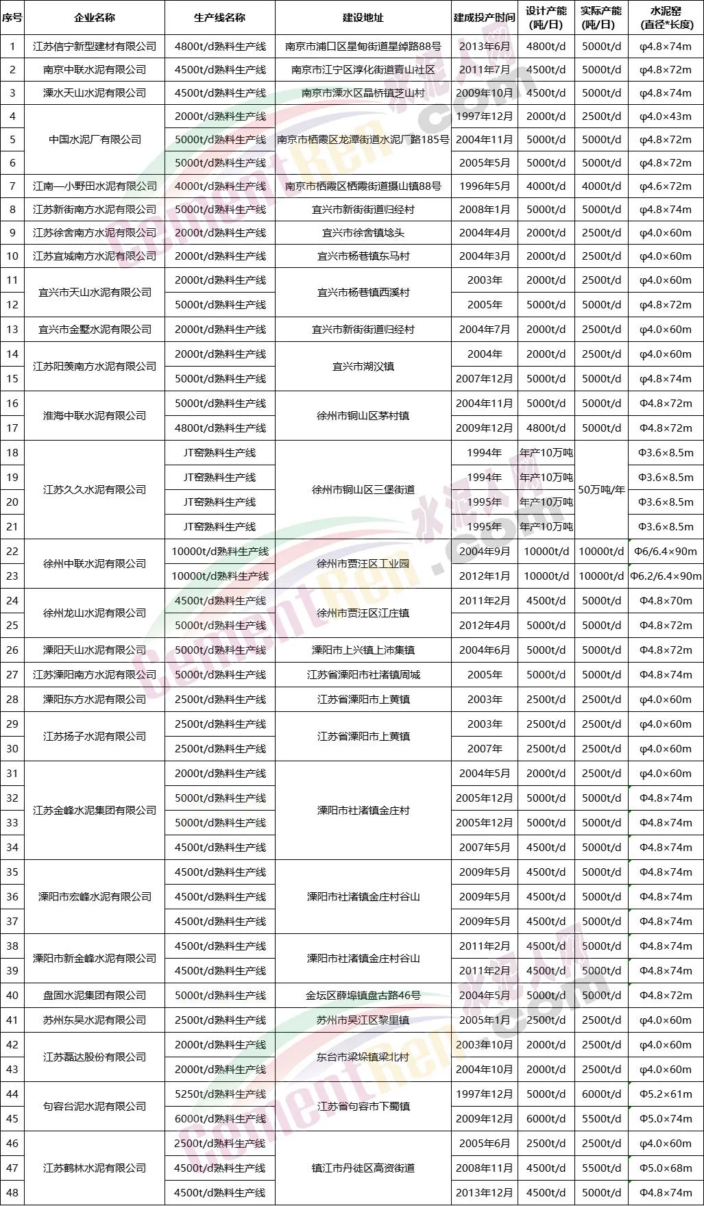 3月2日,江蘇省水泥熟料生產線清單江蘇省工信廳也公布了截止到2021年12月31日的水泥熟料生產線清單 。48條生產線合計產能達到5578萬噸/年。建成時間從1995年5月到2013年底,2013年底后投產生產線為零。