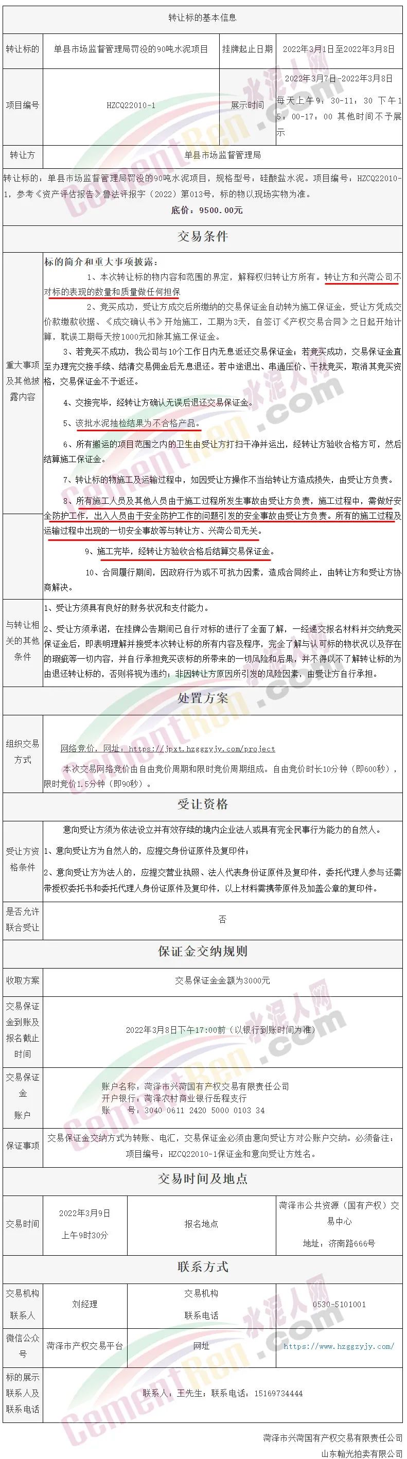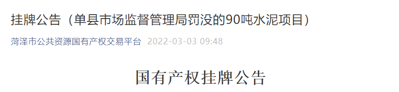 ?日前菏澤市公共資源國有產權交易平臺發布的一則《國有產權掛牌公告》的顯示,將于2022年3月1日至2022年3月8日掛牌轉讓標的為單縣市場監督管理局罰沒的90噸硅酸鹽水泥,底價為9500元 。重大事項及其他披露內容中明確“該批水泥抽檢結果為不合格產品。”