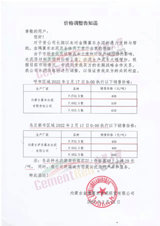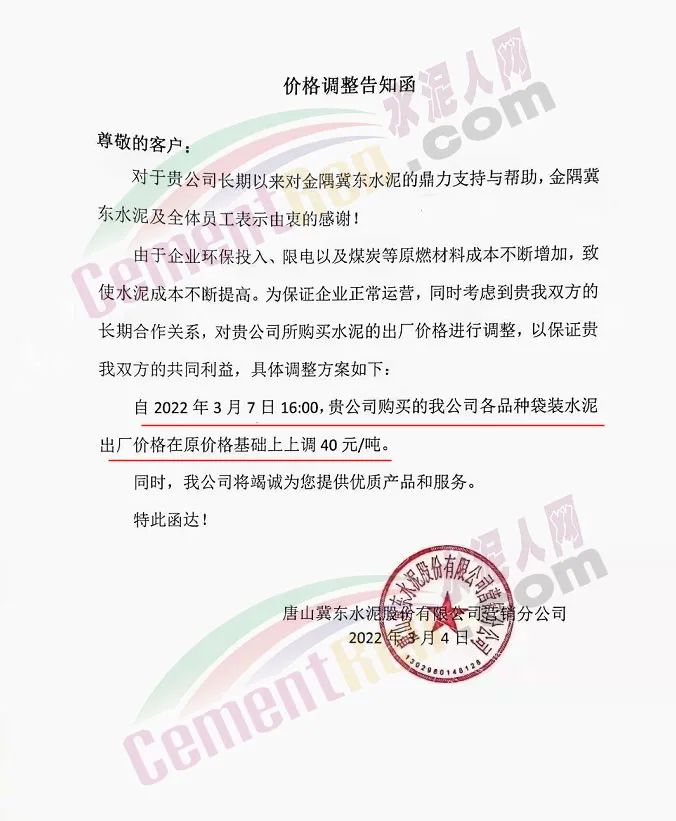 水泥人網通訊員消息,日前唐山冀東水泥股份有限公司營銷分公司通知,由于企業環保投入、限電以及煤炭等原燃材料成本不斷增加,致使水泥成本不斷提高。為保證企業正常運營,自 2022年3月7日16時起,各品種袋裝水泥出廠價格在原價格基礎上上調40元/噸。