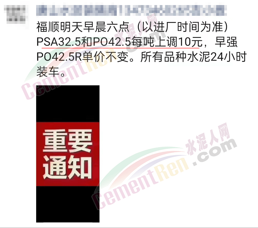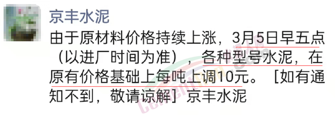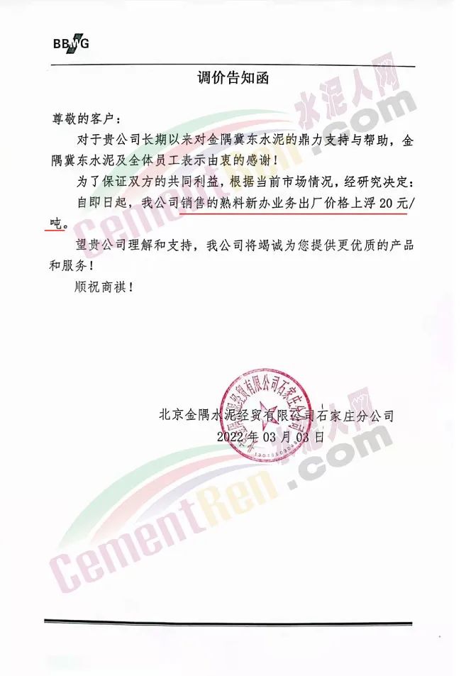 北京金隅水泥經貿有限公司右家莊分公司通知稱,根據當前市場情況,經研究決定∶自即日起公司銷售的熟料新辦業務出廠價格上浮 20元/噸。