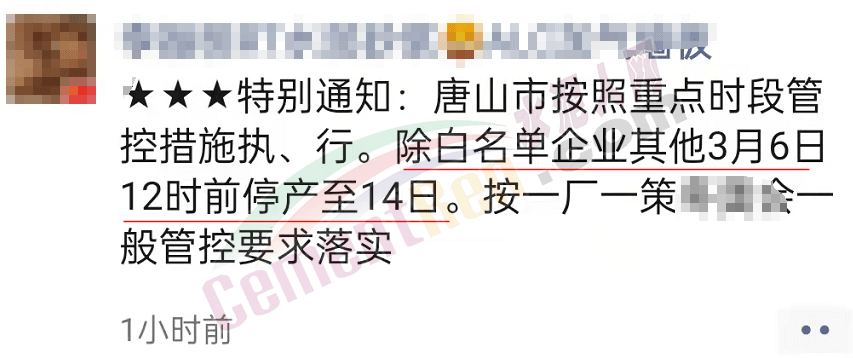 作為冀東水泥的重要生產基建地,唐山地區發布通知,要求所有企業于3月6日12時至3月10日24時按照重點時段一般減排措施執行,3月6日12時各項措施落實到位。移動源、面源同時參照重點時段管控要求一并執行。3月10日后管控措施另行通知。