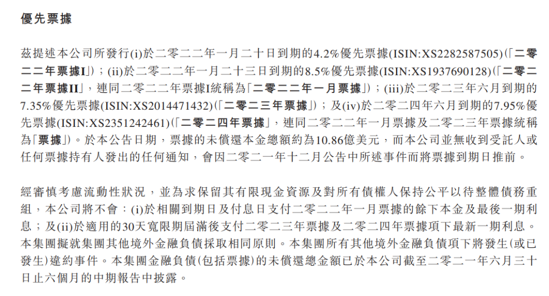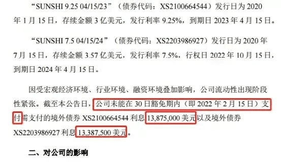 陽光城公告,存續(xù)規(guī)模分別為3億美元和3.57億美元的兩筆美元債未能在30日豁免期內(nèi)(即2022年2月15日)支付利息,合計約2726萬美元(折合人民幣約1.73億元),構(gòu)成實質(zhì)性違約。