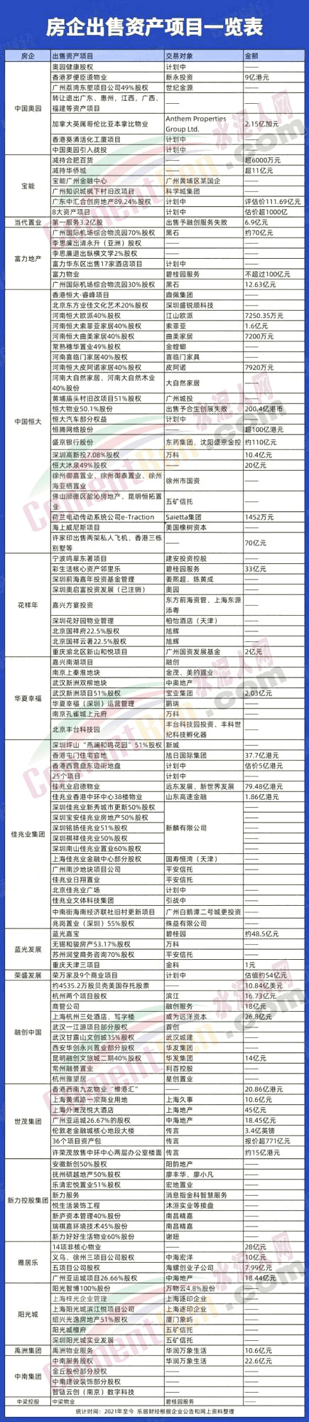 隨著地產(chǎn)調(diào)控政策趨緊,多家房地產(chǎn)企業(yè)的資金壓力持續(xù)上升,前有藍光、華夏幸福、泰禾,后有恒大、佳兆業(yè)、奧園,還有的則在暴雷的路上。房企高償債壓力之下,違約風險日益加大,越來越多的放棄開始割肉賣身。恒大、融創(chuàng)、世茂、中南、禹洲、奧園、雅居樂、花樣年等房企,均已成功將部分資產(chǎn)轉(zhuǎn)讓出去。
