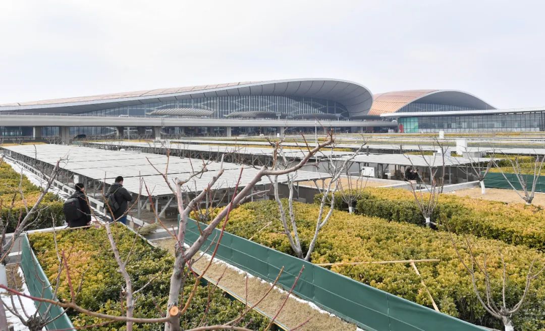 ?▲2022年2月18日,大興機場停車樓屋頂被光伏發(fā)電組件和綠植所覆蓋,預計可實現(xiàn)每年碳減排量2500噸左右。新京報記者 李木易 攝