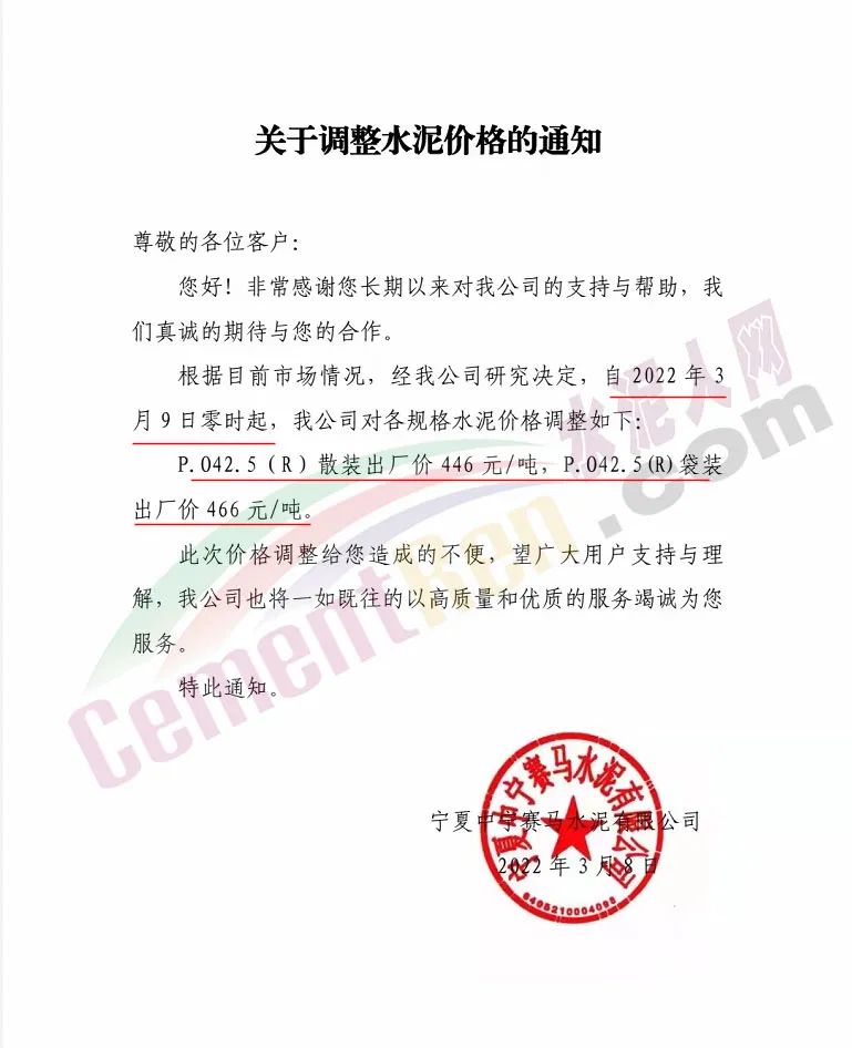 寧夏中寧賽馬水泥有限公司通知,根據目前市場情況,經公司研究決定,自3月9日零時起,公司對各規格水泥價格進行調整。其中P.O42.5(R)散裝出廠價446元/噸,P.O42.5(R)袋裝出廠價466元/噸。